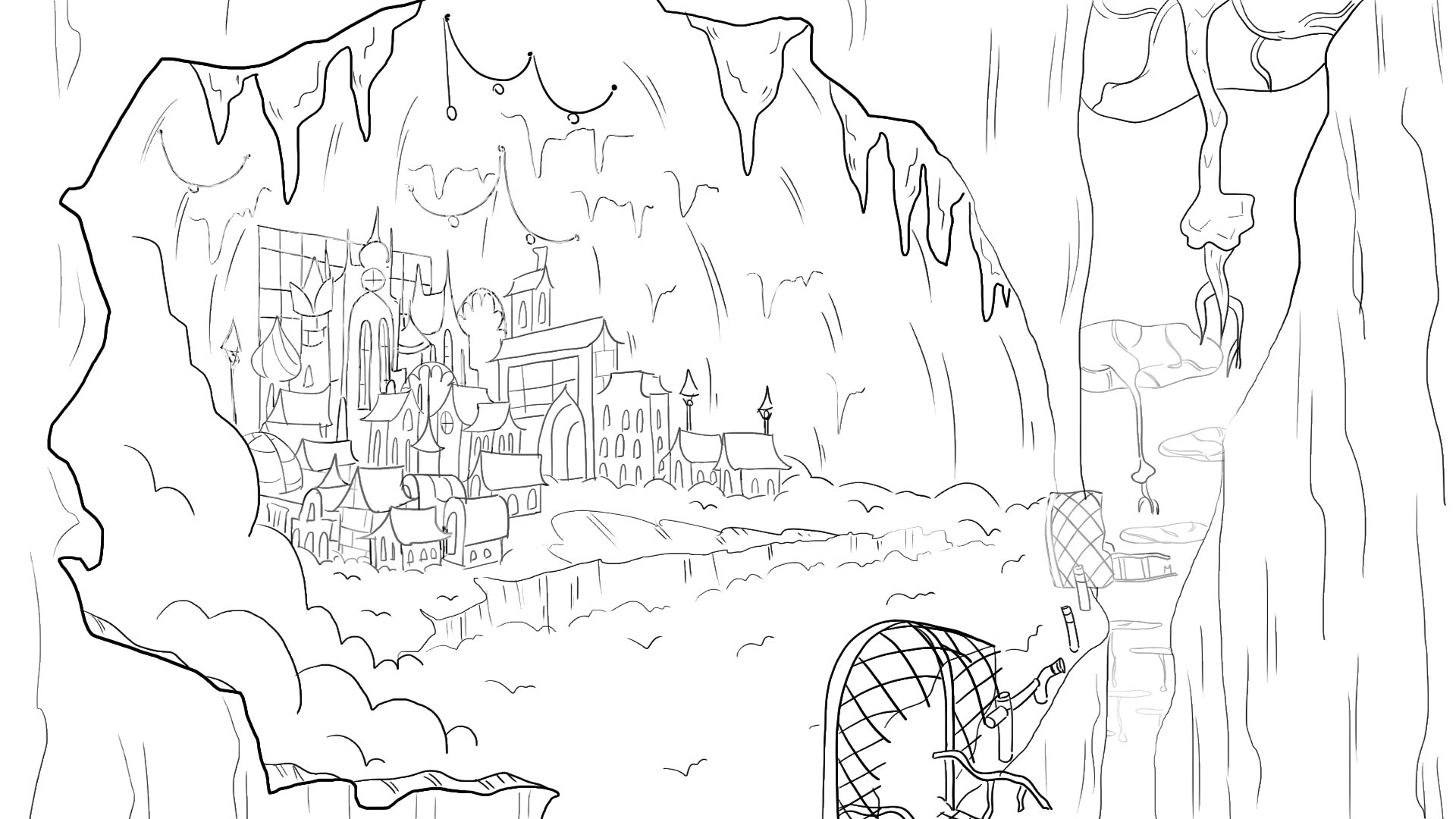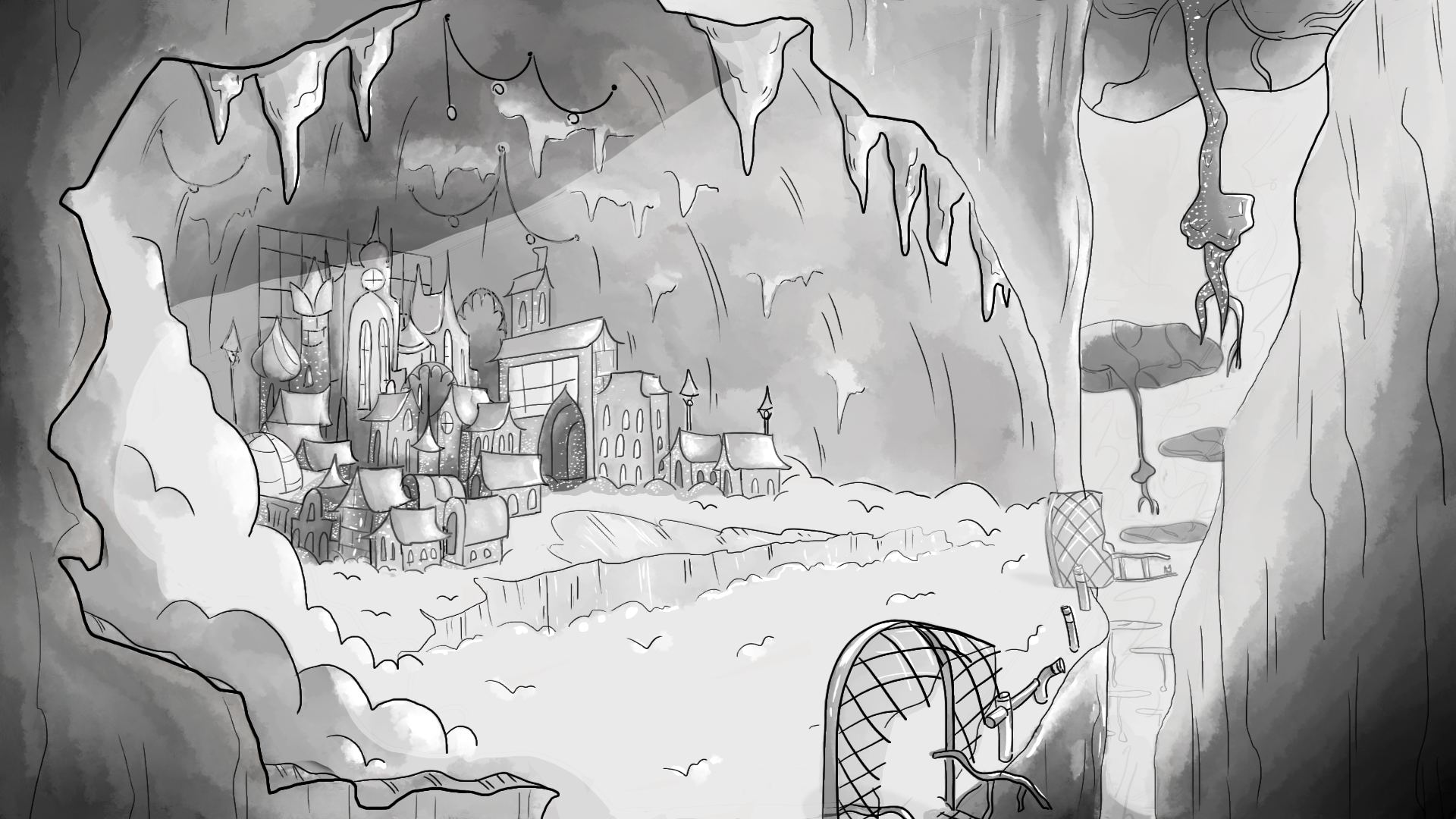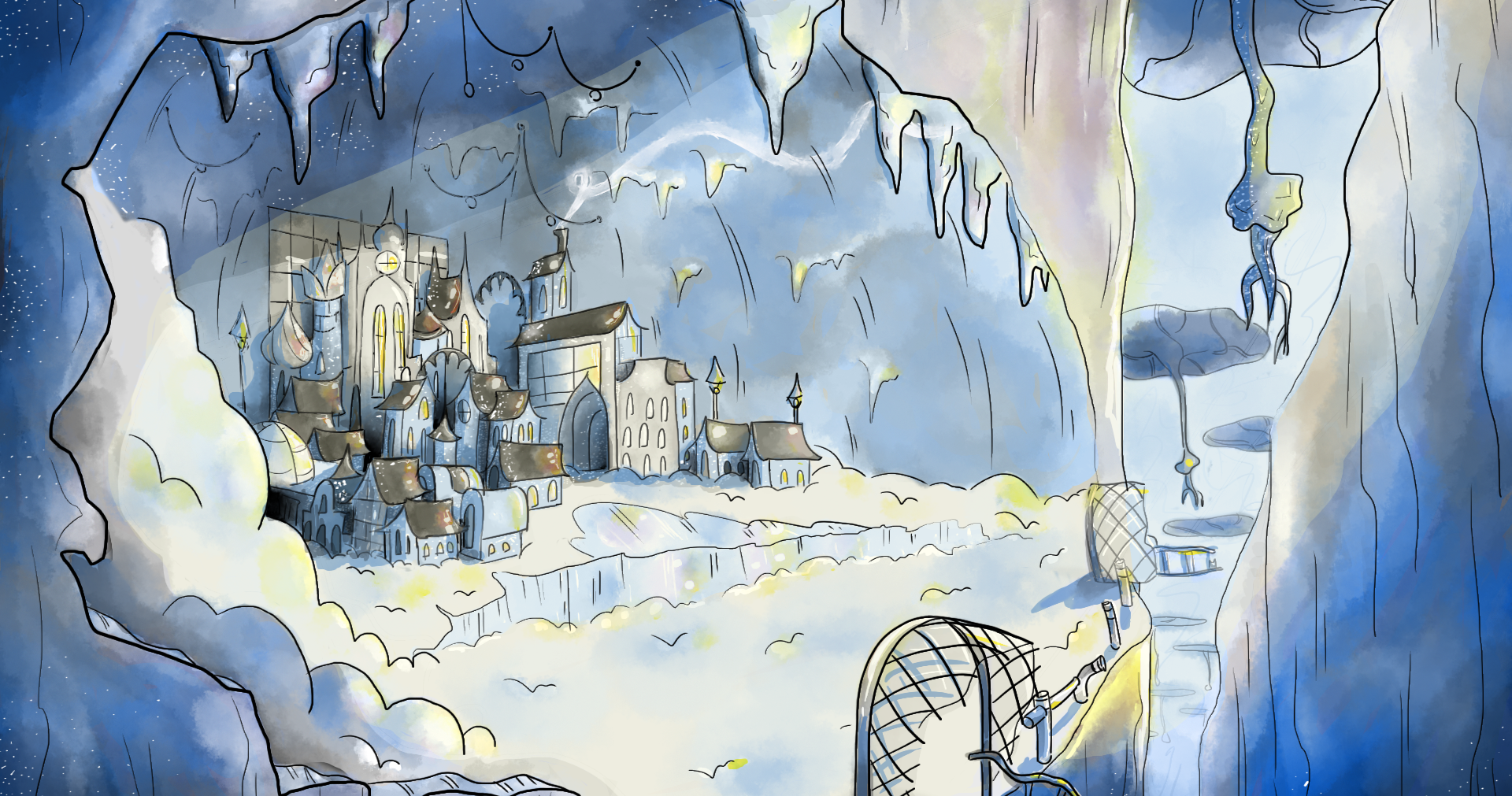 Concept art in relation to the 'Winter Sunlight' This depicts an ice city sculpted beneath a winter wonderland. A blend of machine and ice.